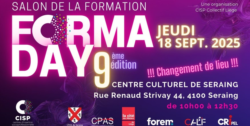 L'invité du jour, Arnaud Milstein, un des directeurs du réseaux des Centres d'Inssertion Socio-Porfessionnelle (CISP) nous parle du Foma Day. Le Forma Day, c'est une journée consacrée à la formation. La journée vise à promouvoir la formation auprès des personnes peu qualifiées, demandeuses d'emploi ou en demande de réorientation. Pour la neuvième édition du Forma Day qui se déroulera le 18 septembre, l'événement déménage d'Herstal vers le Centre culturel de Seraing.