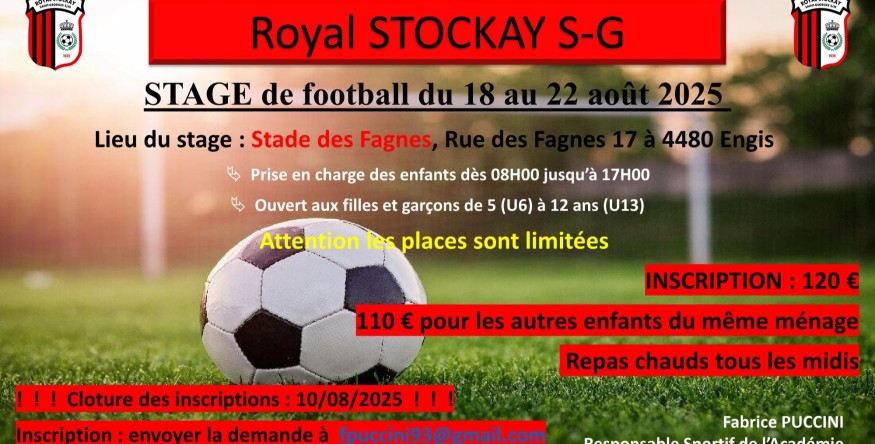 L'été est footballistique au Royal Stockay Saint-Georges-sur-Meuse. Le club organise des stages d'été du 18 au 22 août à destination des enfants de 5 à 12 ans. Les stages sont ouverts à tous, filles ou garçons, quelque soit le niveau des enfants. ATTENTION, les inscriptions sont limitées et doivent être faites avant le 10 août.